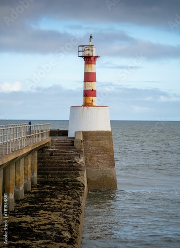 Vertical shot of a lighthouse at the coast in Amble, Northumberland, England