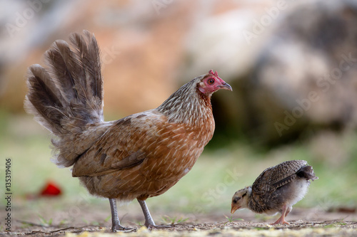 Verwilderte Henne mit Küken auf Kauai, Hawaii, USA.