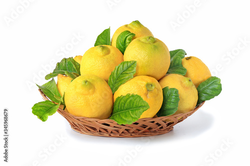 Very useful lemons in wicker basket with leaves isolated on white