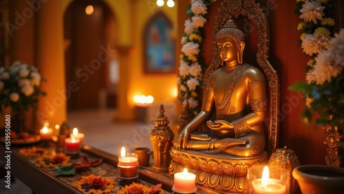 Vesak, Buddha Purnima. Gold statue of Buddha sits on a table with candles lit around it. The scene is serene and peaceful