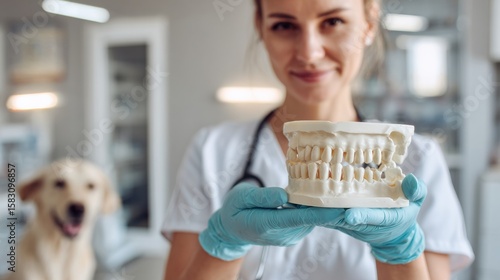 Vet Demonstrating Dental Care Techniques Using Dog Jaw Model in Clinic Setting, Highlighting Importance of Oral Hygiene for Pets