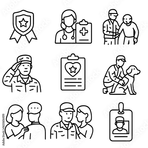 Veterans Healthcare Icons. Outline style icons of Veterans Healthcare Workers: veteran support badge, VA clinic staff, elderly