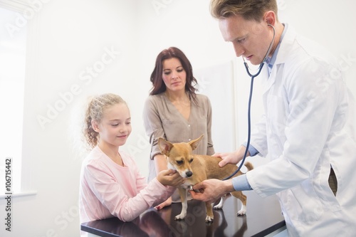 Veterinarian checking dog with stethoscope