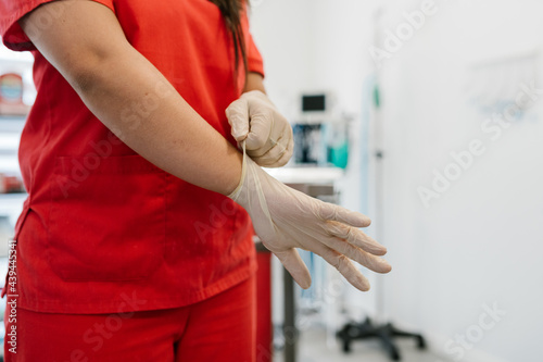 Veterinarian putting on gloves in clinic