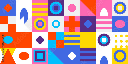 Vibrant abstract geometric mosaic pattern with colorful squares, circles, triangles, ovals creating a modern, dynamic background illustration.