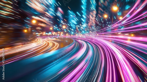 Vibrant abstract image depicting glowing neon pink and blue wave like lines moving rapidly through an urban futuristic landscape
