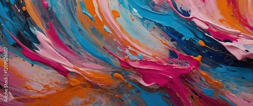 Vibrant abstract painting with multicolor paint stains and splashes. Colorful grunge liquid paint stains artwork header design.