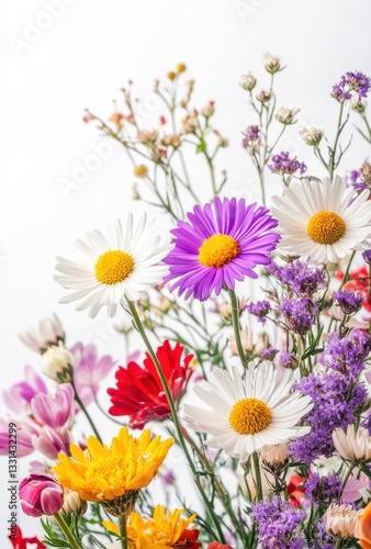Vibrant and Colorful Floral Display Featuring Diverse Blooms of Daisies, Wildflowers, and Seasonal Blossoms Against a Soft White Background