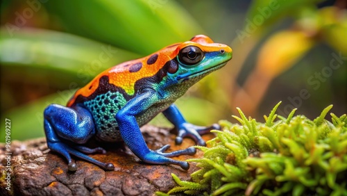 Vibrant and colorful poison dart frog in natural habitat, amphibian, rainforest, tropical, toxicity, bright, poisonous, wildlife