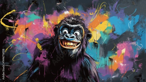 Vibrant and expressive chimpanzee portrait with a colorful paint splatter effect, capturing the primate's intense gaze