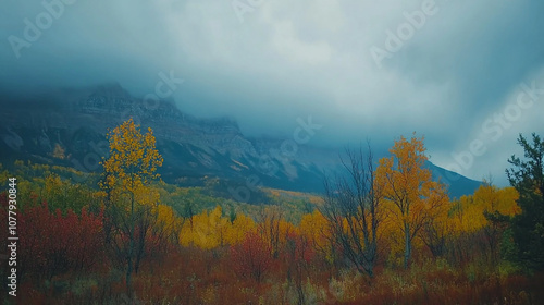Vibrant autumn foliage in a misty mountain landscape near the colorful hills at dusk