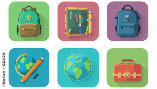 Vibrant back to school icon set for education projects featuring backpack, blackboard, globe, lunchbox perfect for website, app, and marketing
