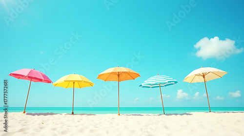 Vibrant Beach Scene with Colorful Umbrellas Against Blue Sky on Sunny Summer Day Seaside