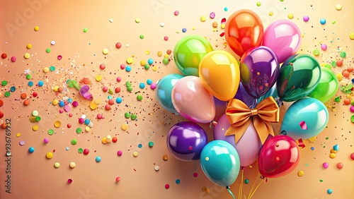 Vibrant birthday card with colorful balloons, confetti, and a big bow on a pastel background, conveying joy, celebration, and festive atmosphere.