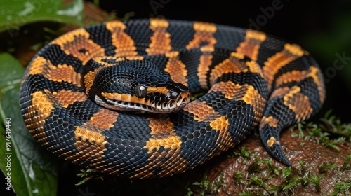 Vibrant Black and Orange Banded Snake Coiled on Moss-Covered Branch in a Lush, Green Jungle Setting Under Low Light Conditions