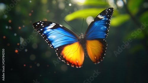 Vibrant blue butterfly floats in jungle, bokeh background, nature serenity