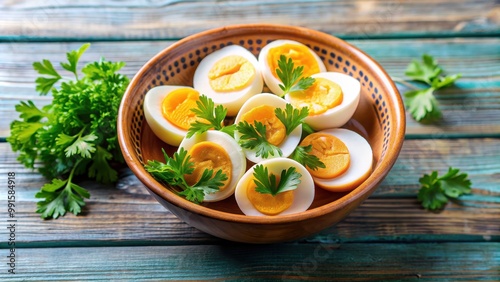Vibrant boiled eggs in a bowl with parsley, boiled eggs, vibrant, colorful, bowl, parsley, healthy, fresh