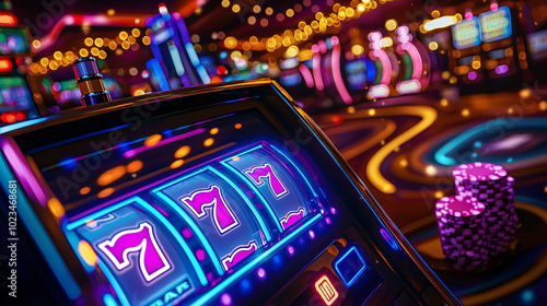 vibrant casino scene featuring close up of slot machine with bright neon lights and colorful chips. atmosphere is lively and exciting, perfect for gaming enthusiasts