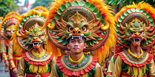 Vibrant celebration captures male students dressed in ornate Barongan costumes, a mythical lion-headed creature, during an Indonesian independence festival, showcasing cultural heritage.