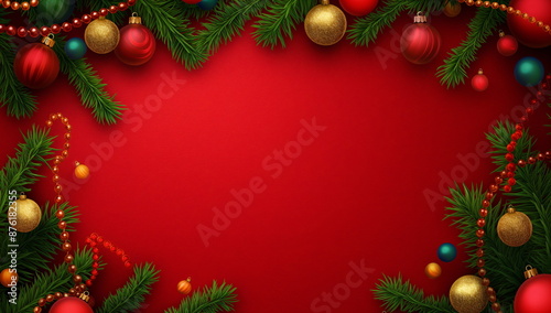 Vibrant Christmas border with green pine branches and colorful baubles on a rich red background, festive holiday cards, banner with copy space