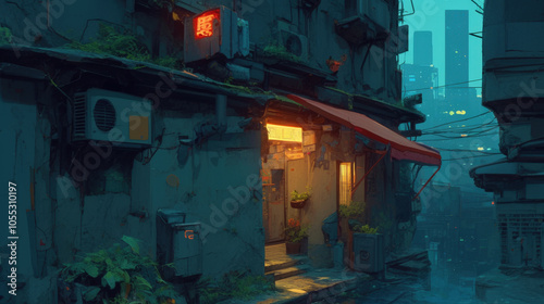 vibrant city alley at dusk, illuminated by neon lights and reflections. scene captures blend of urban life and atmospheric charm, with greenery adding touch of nature