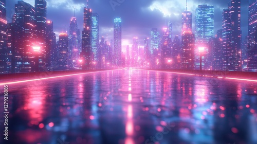 Vibrant City Skyline at Night With Neon Lights Reflecting on Wet Pavement