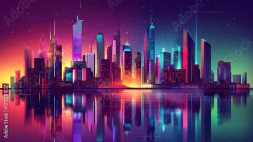 Vibrant City Skyline at Night with Reflections and Colorful Lights