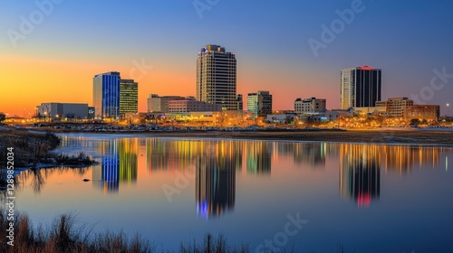 Vibrant City Skyline with Fireworks Reflection at Dusk