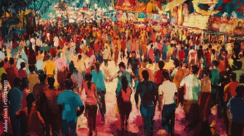 Vibrant Colorful Crowd Moving Through City Streets at Night
