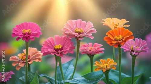 Vibrant colorful zinnias in a garden bathed in warm sunlight.