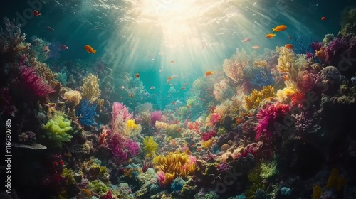 Vibrant coral reef teeming with colorful fish, sunbeams illuminating the underwater scene.