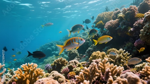 Vibrant Coral Reef with Colorful Fish Swimming in Clear Blue Water