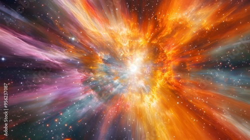 Vibrant cosmic explosion radiating energy and light in a stunning display of color and motion across the universe.