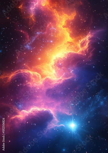 Vibrant cosmic nebula with fiery clouds and distant stars in deep space.