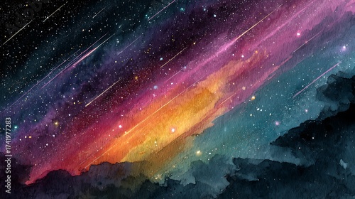 Vibrant cosmic phenomenon streaking across the night sky with nebulae and stars