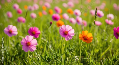 Vibrant cosmos flowers in a field. A profusion of pink and orange cosmos blossoms amidst green grass. Soft sunlight bathes the scene