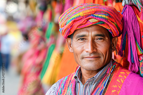 Vibrant cultural portrait of a man in traditional attire at urban market