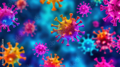Vibrant digital illustration of colorful viruses in microscopic view