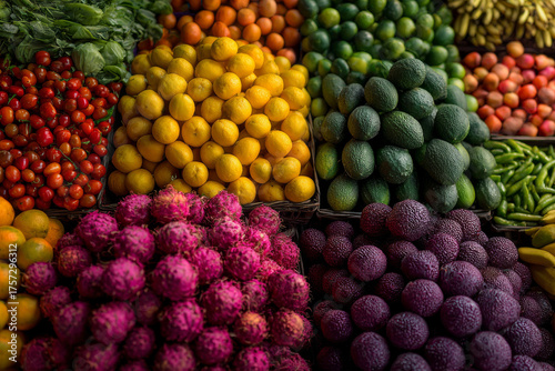 Vibrant display of fresh fruits and vegetables at market, including lemons, avocados, and dragon fruits, showcasing colorful variety