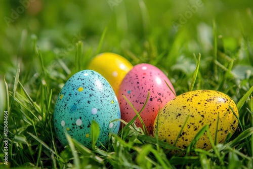 Vibrant easter eggs hidden among lush grass for joyful spring festivities