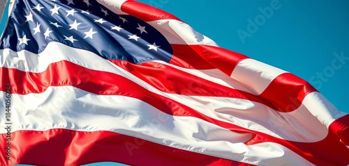 Vibrant fabric ripples in the breeze, showcasing the iconic design of the American flag, nation, patriotism