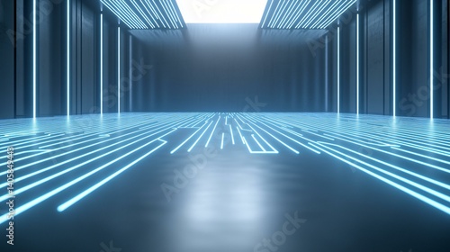 Vibrant factory floor with detailed assembly arms, minimal glowing blue digital circuit lines and data points hovering, radiant indoor light from open windows casting crisp arm shadows, smart
