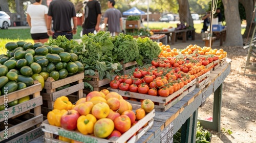 Vibrant farmers' market display featuring an assortment of fresh, ripe tomatoes in a bustling outdoor setting.
