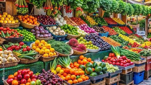 Vibrant farmers market stall overflowing with a variety of fresh, colorful fruits and vegetables , abundance, vibrant