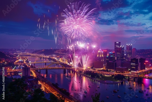 Vibrant Fireworks Display Over Pittsburgh Skyline at Dusk, Illuminating Bridges and Waterfront. Celebration and Urban Festivity Themes