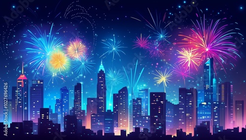 Vibrant Fireworks Illuminate the Night Sky Above a Modern Cityscape Celebration