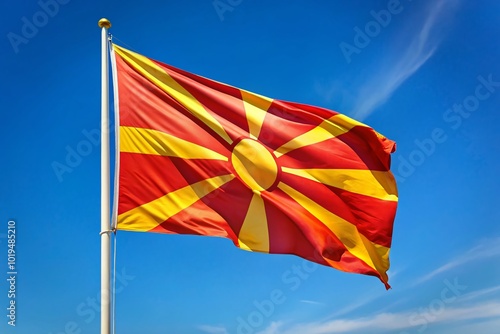 Vibrant Flag of the Republic of Macedonia Waving Gracefully Against a Clear Blue Sky Background