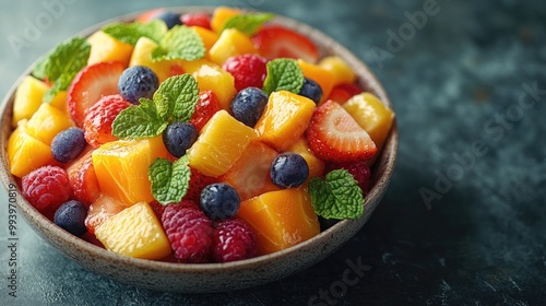 Vibrant Flat Lay of Fruit Salad Garnished with Fresh Mint for Healthy Living Inspiration