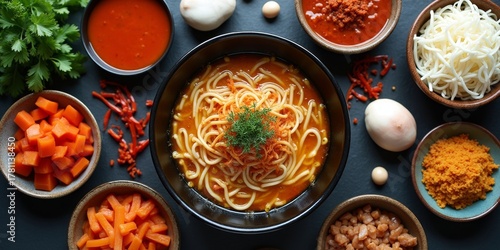 Vibrant flat lay of traditional Korean fermented foods like kimchi and gochujang with ramen ingredients. Overhead view showcasing Korean culinary culture.