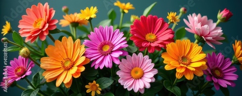 Vibrant floral bouquet, various blooms, lush greenery , spring, floral, photography